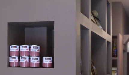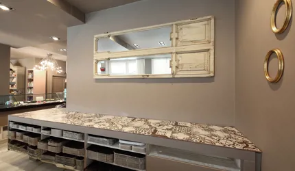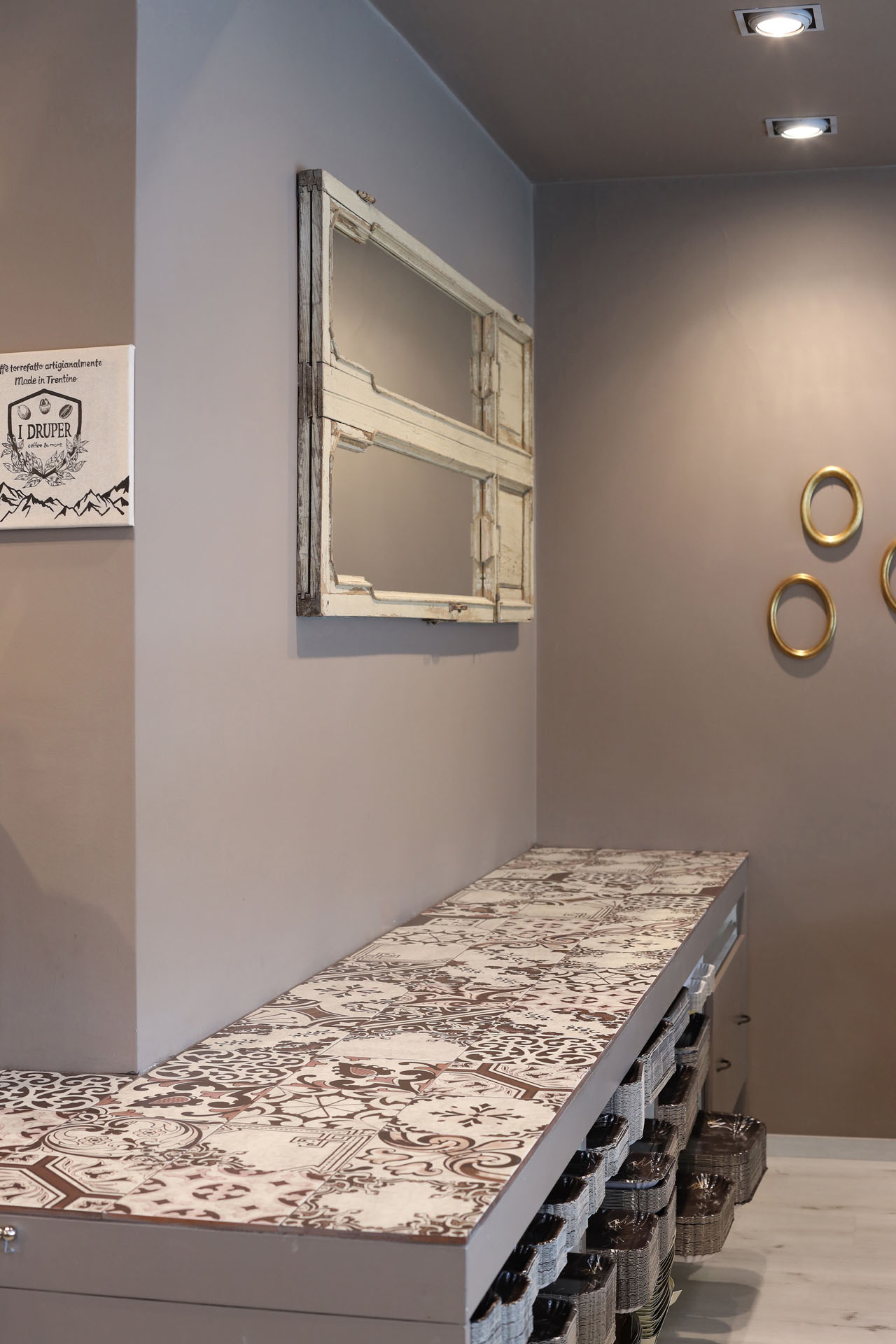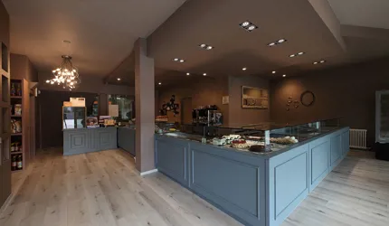 Im Geschäft entschied man sich für LVT-Fußböden mit einem authentischen Holzeffekt, welche über den bestehenden Boden verlegt wurden. Diese Bodenbeläge zeichnen sich durch ihre hochwertige Qualität aus und sind zugleich pflegeleichte und äußerst strapazierfähige Designelemente. Zusätzlich haben wir wasserundurchlässige, dekorative Zementfliesen für die Arbeitsflächen ausgewählt und elegante Kunstharze im Eingangsbereich und Badezimmer verwendet. Diese Gestaltungselemente schaffen nicht nur eine ästhetisch ansprechende Atmosphäre, sondern tragen auch dazu bei, dass in dieser Bäckerei alle Sinne verwöhnt werden, sowohl visuell als auch kulinarisch.