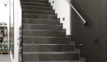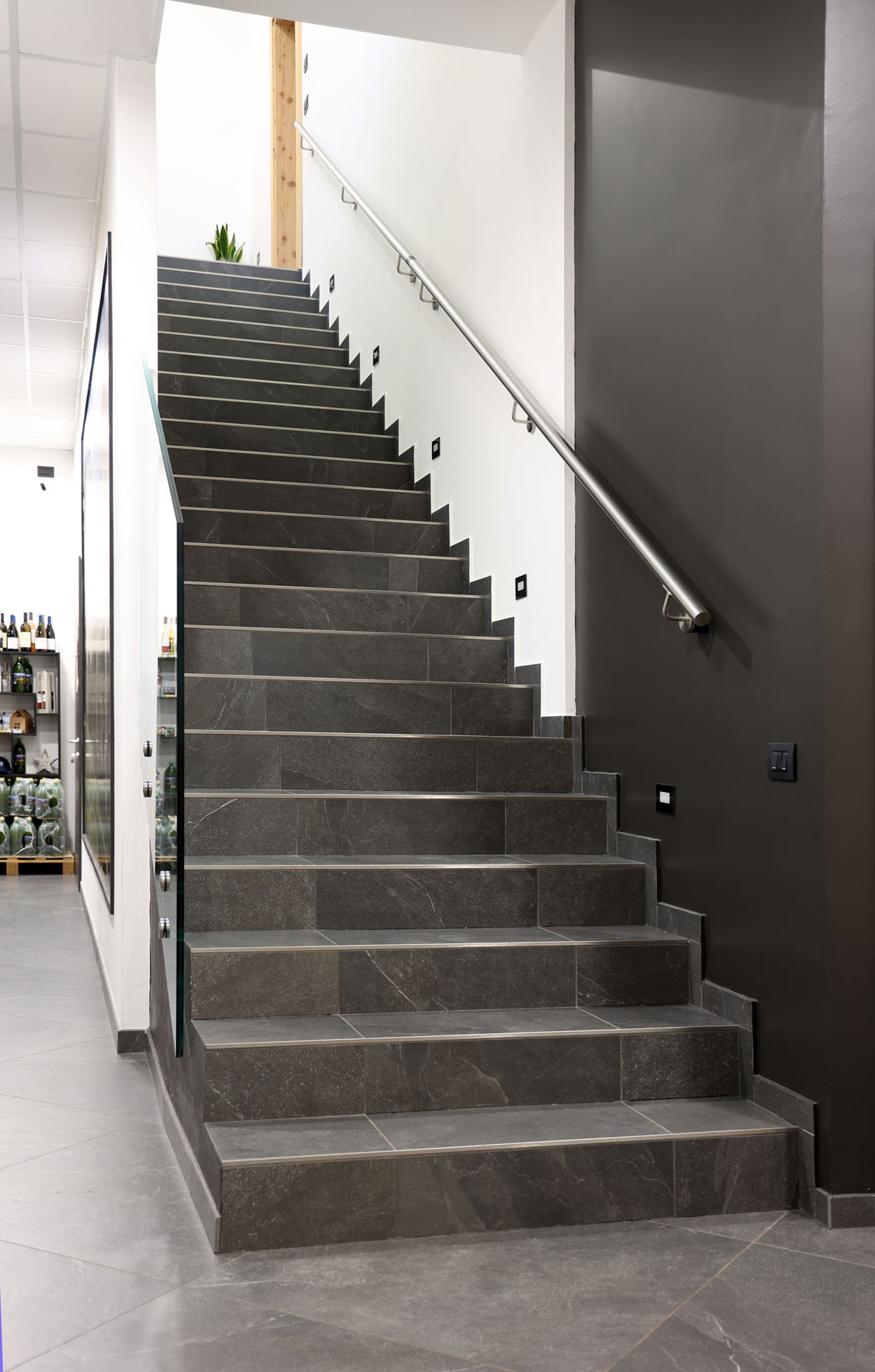 Um eine Atmosphäre von Gemütlichkeit zu kreieren, wurde eine anthrazitgraue Fliese mit feinen hellen Adern ausgewählt. Diese Fliese durchzieht das gesamte Haus und bietet ihm eine Kontinuität, die nur durch Möbelelemente und natürlichen Holzdetails unterbrochen wird. Die Entscheidung für dieses Produkt geht über reine Ästhetik hinaus: Die Feinsteinzeugfliese mit Schiefereffekt ist pflegeleicht, robust und langlebig. Durch die harmonische Verbindung von Design und Funktionalität schafft diese Fliese eine ästhetische Umgebung und eignet sich perfekt für Gaststättenbereiche.
