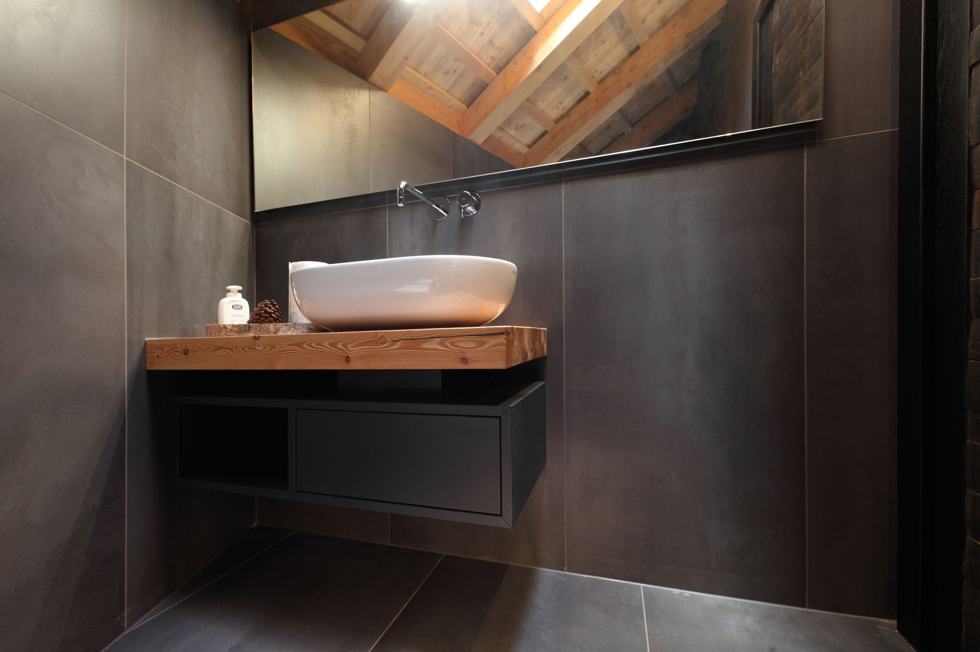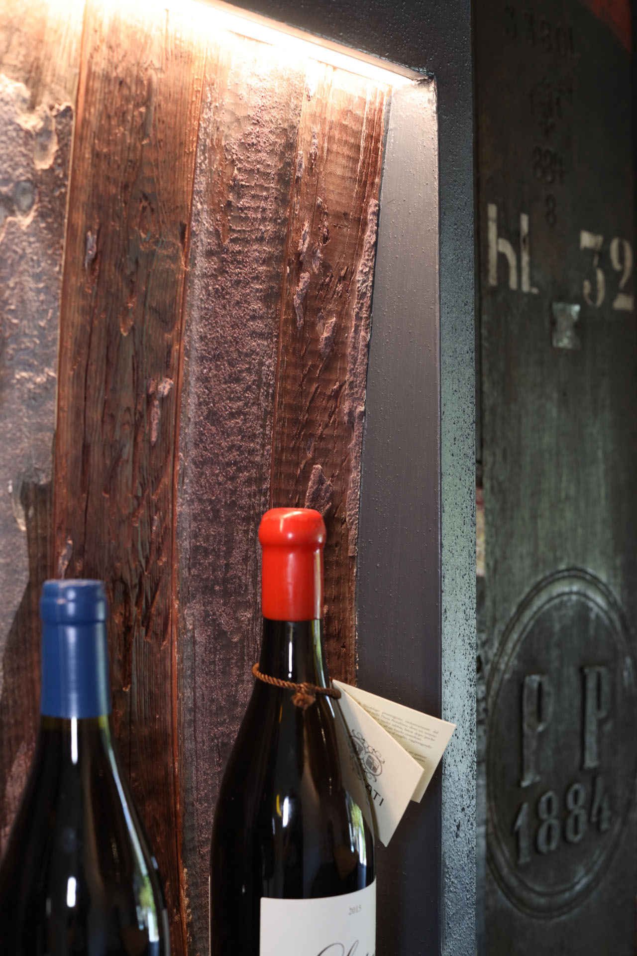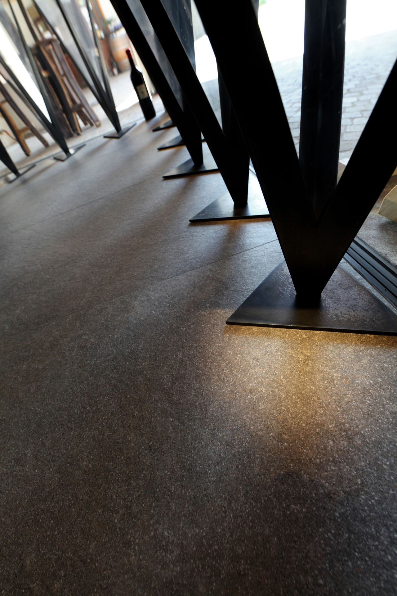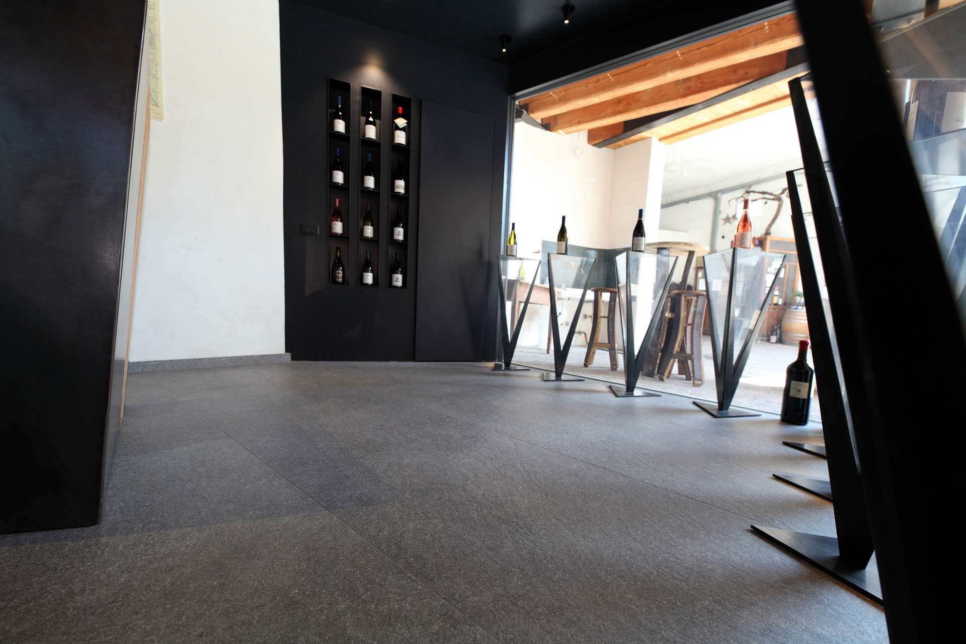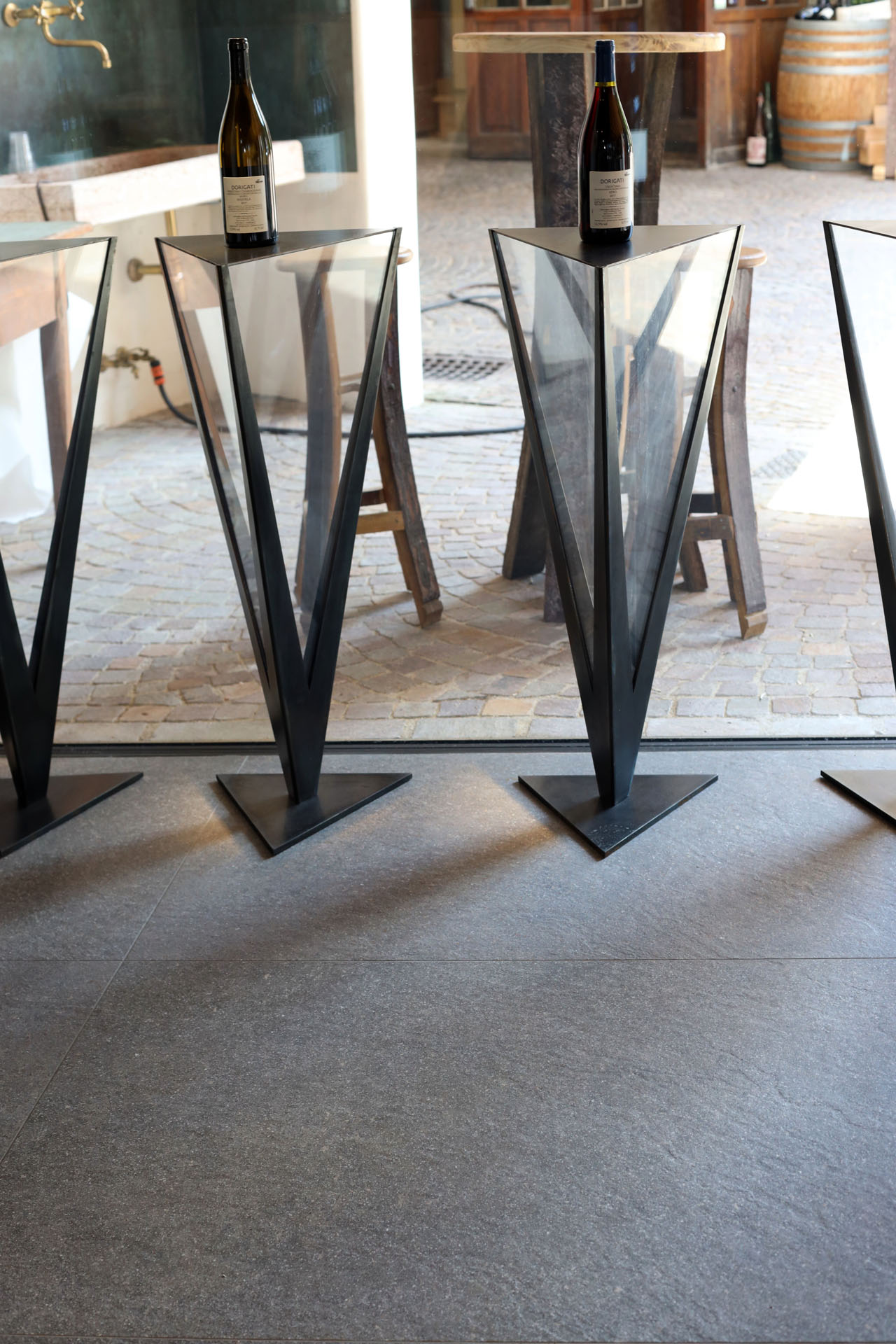 Im Verkostungsraum der Kellerei hat man sich für großformatige Fliesen aus Feinsteinzeug mit einem eleganten Metalleffekt entschieden. Diese Bodenbeläge verleihen dem Raum eine luxuriöse Atmosphäre und betonen gleichzeitig die Raffinesse der Weine. Der Boden des Geschäfts ist mit Feinsteinzeug gestaltet, das einen faszinierenden Porphyr-Effekt aufweist. Diese Wahl ist eine Hommage an die Geschichte des Cembra Tals -bekannt für ihre reichen Vorkommen an Porphyr-Gestein und Quarz. Durch die Verwendung dieser regionalen Produkte schafften wir nicht nur eine Verbindung zur Natur und Tradition, sondern den Besuchern wird ein Einblick in die einzigartige Geschichte und Charakteristik der Kellerei und der Region gegeben.