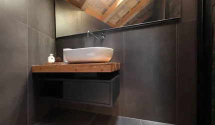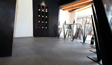 Im Verkostungsraum der Kellerei hat man sich für großformatige Fliesen aus Feinsteinzeug mit einem eleganten Metalleffekt entschieden. Diese Bodenbeläge verleihen dem Raum eine luxuriöse Atmosphäre und betonen gleichzeitig die Raffinesse der Weine. Der Boden des Geschäfts ist mit Feinsteinzeug gestaltet, das einen faszinierenden Porphyr-Effekt aufweist. Diese Wahl ist eine Hommage an die Geschichte des Cembra Tals -bekannt für ihre reichen Vorkommen an Porphyr-Gestein und Quarz. Durch die Verwendung dieser regionalen Produkte schafften wir nicht nur eine Verbindung zur Natur und Tradition, sondern den Besuchern wird ein Einblick in die einzigartige Geschichte und Charakteristik der Kellerei und der Region gegeben.