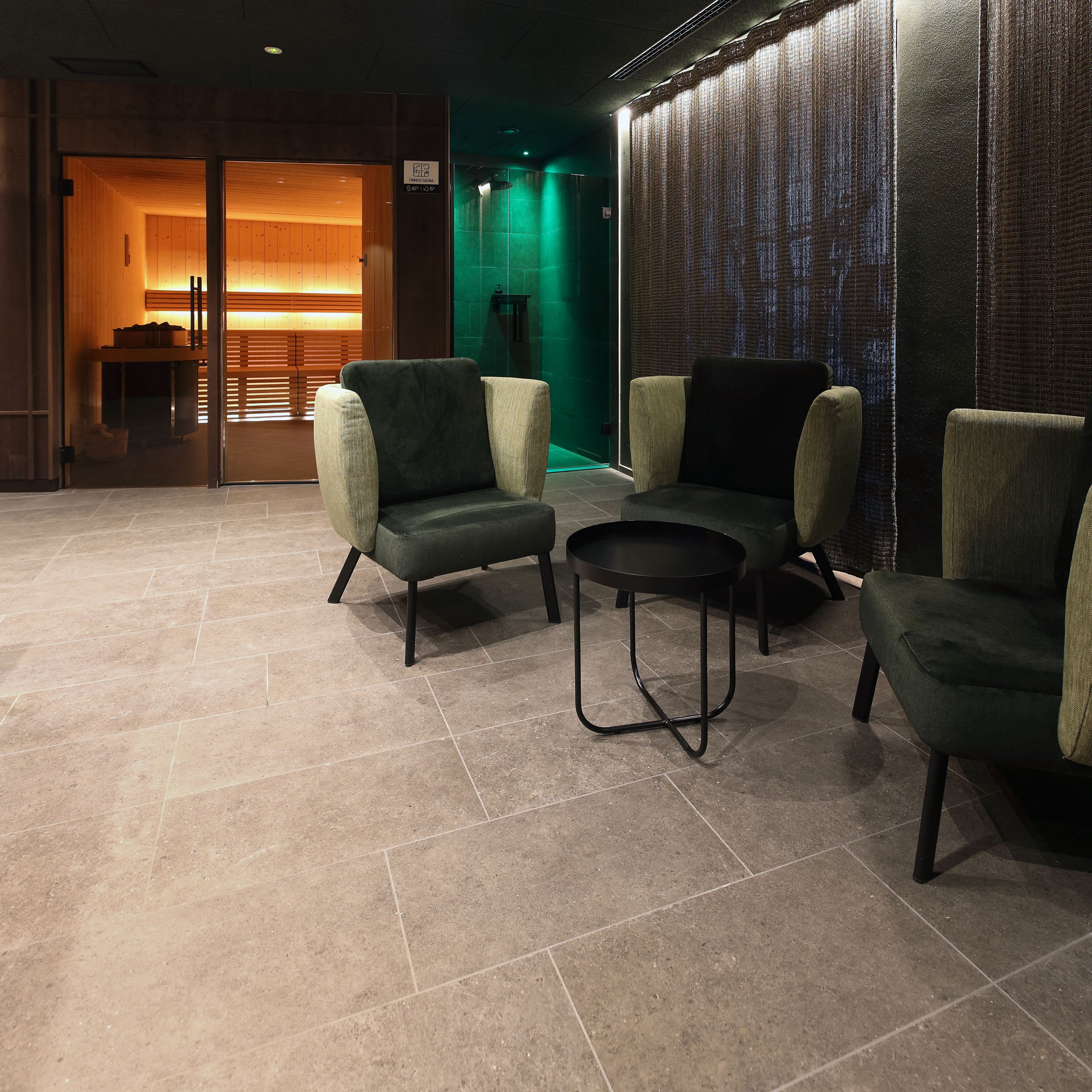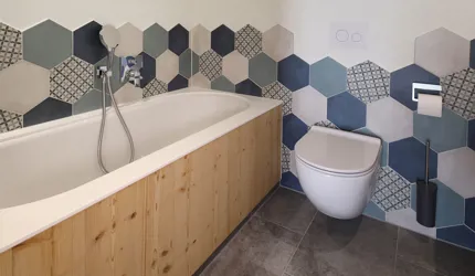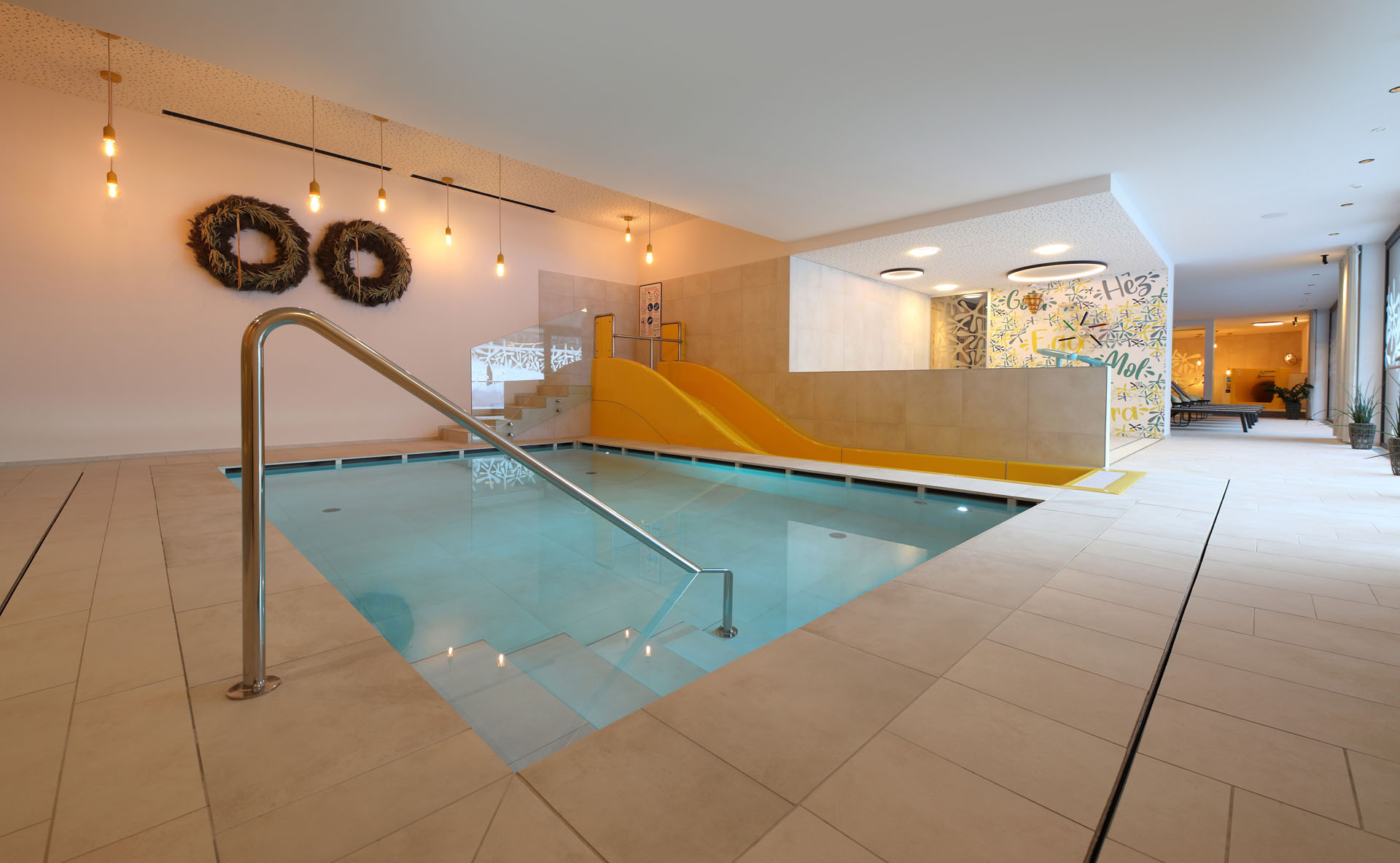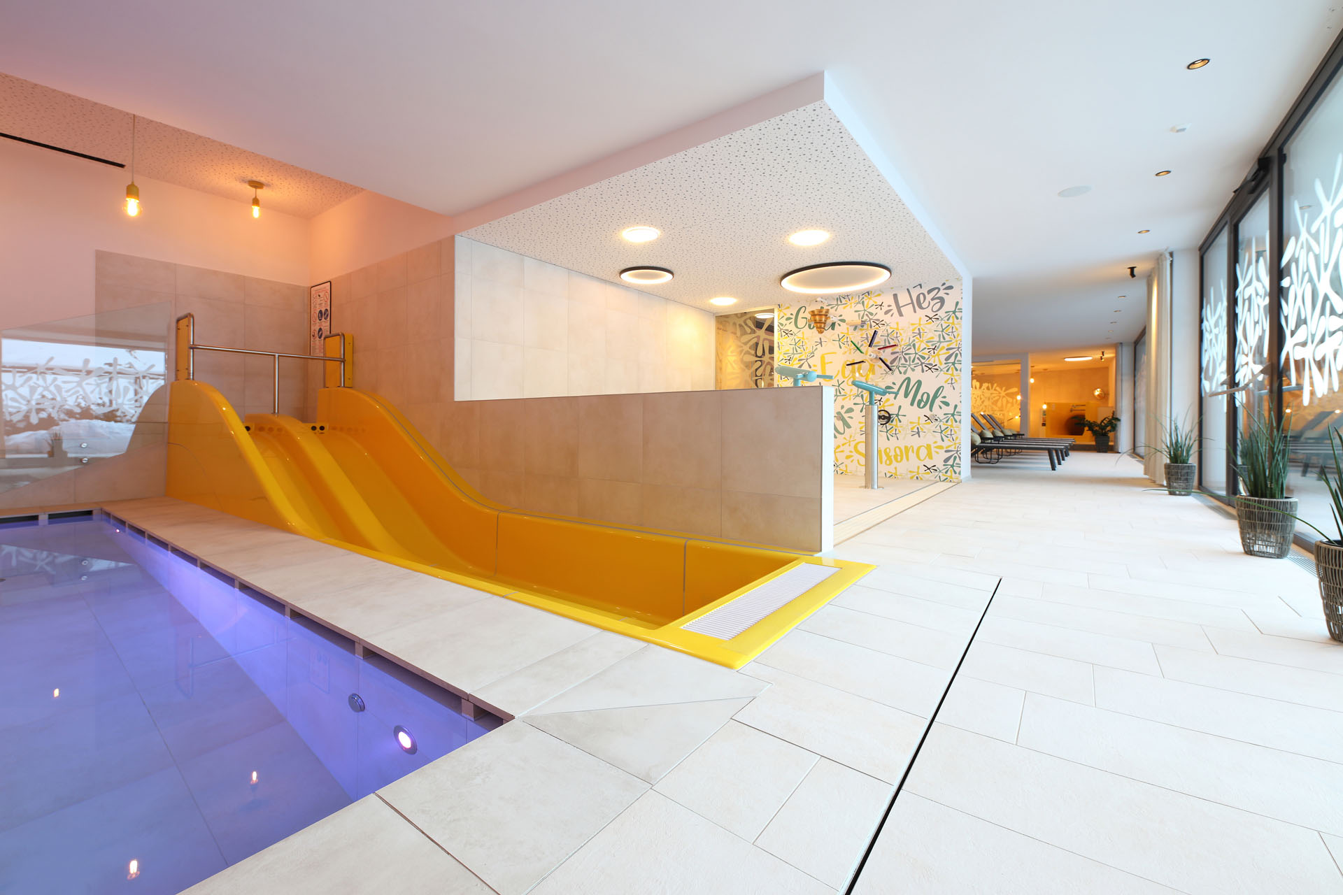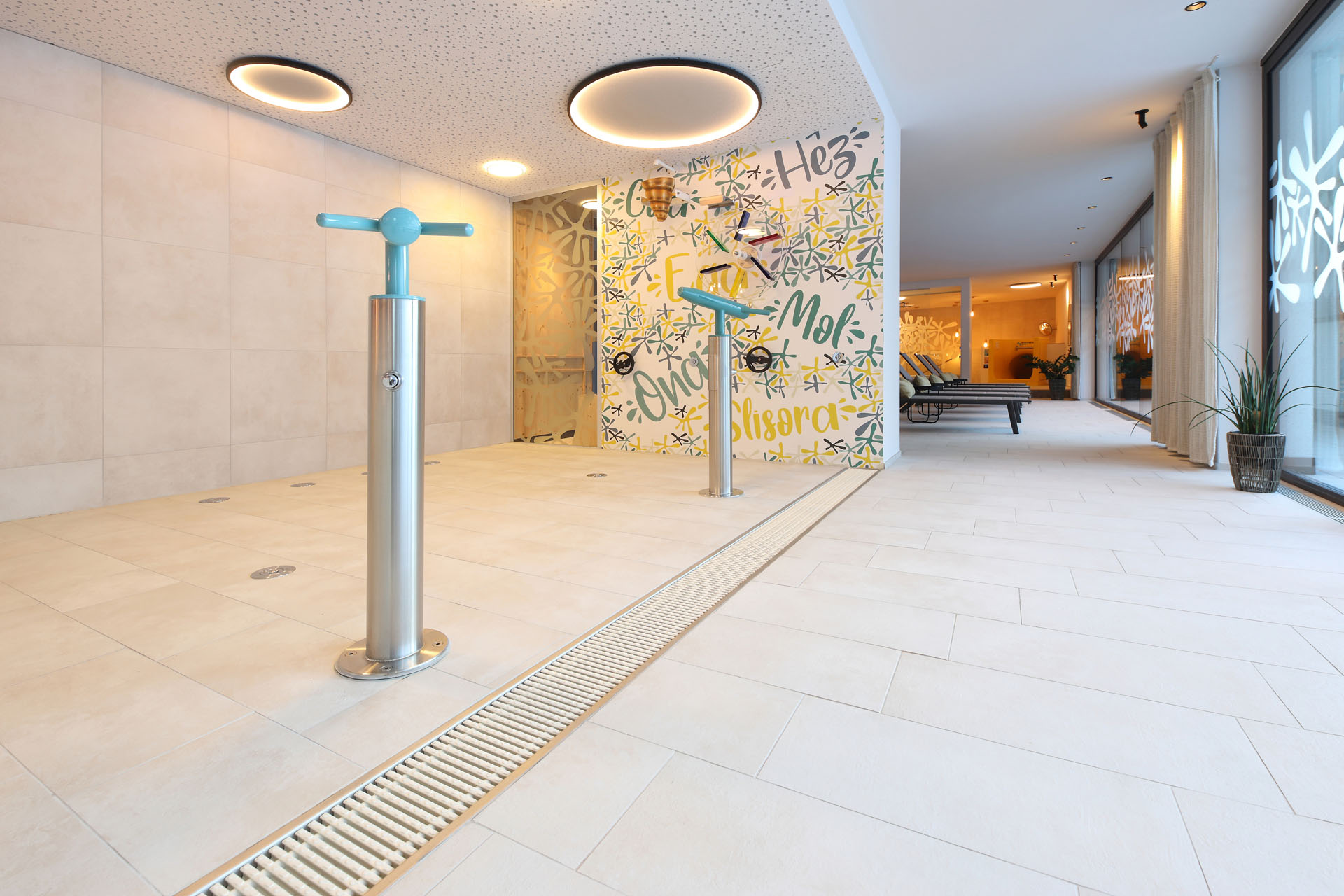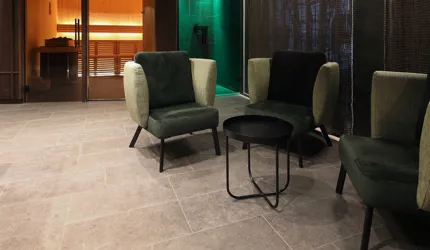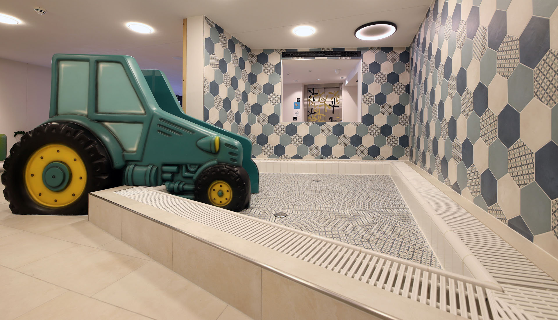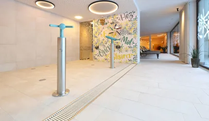 Wir durften im Movi Family Apart-Hotel die gesamte Fliesenlieferung übernehmen und mit den Architekten bei der Auswahl zusammenarbeiten. Den Eingangsbereich verkleidete man mit Feinsteinzeugfliesen in Mehrformatverlegung der gleichen Farbe. Diese Art der Verlegung verleiht dem Raum Lebendigkeit und Bewegung. Dieselbe, dafür aber rutschfeste Fliese wurde in den Schwimmbädern verlegt. Im SPA Bereich der Eltern, wählte man eine dunkle, strukturierte Fliese, welche passend zu den bereits gewählten Schlammfarben war. In allen Kinderbereichen fiel die Auswahl auf Farben, Formen und Fantasie, weshalb der Baby Pool mit bunten 6-eck-Feinsteinzeugfliesen verlegt wurde. Auch in den Appartements wurden die Farbgegensätze verwirklicht und der Kundenwunsch einmal mehr unterstrichen. Die auffallende Einrichtung wirkt, wohin das Auge reicht, wie ein Abenteuer.