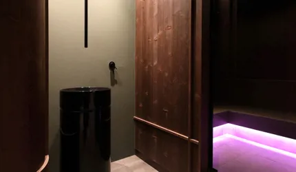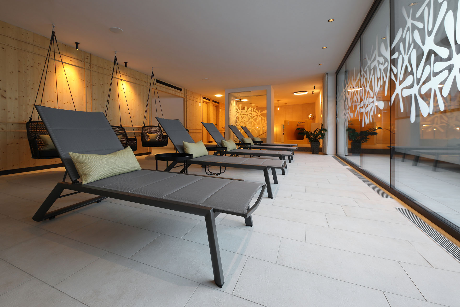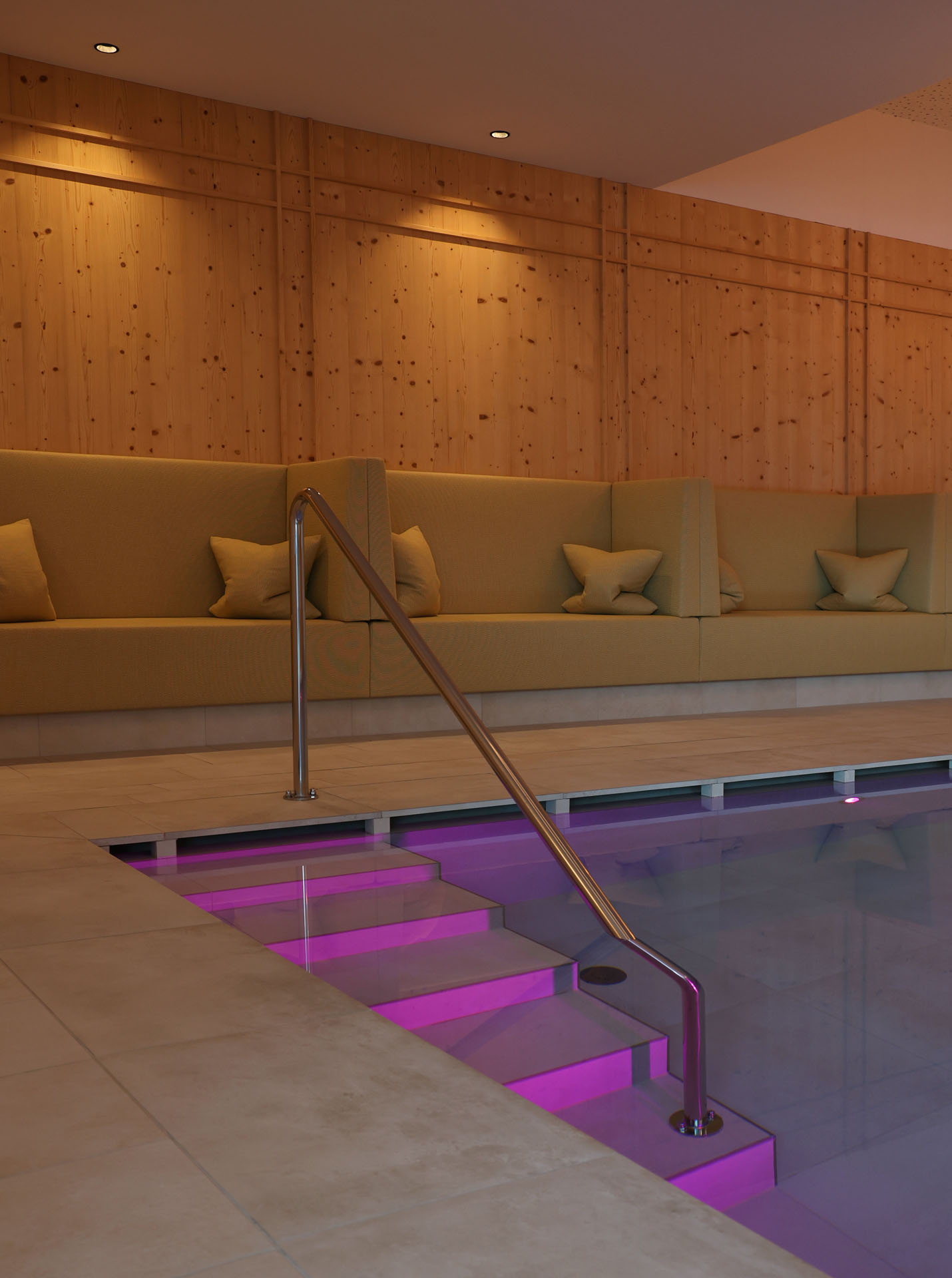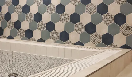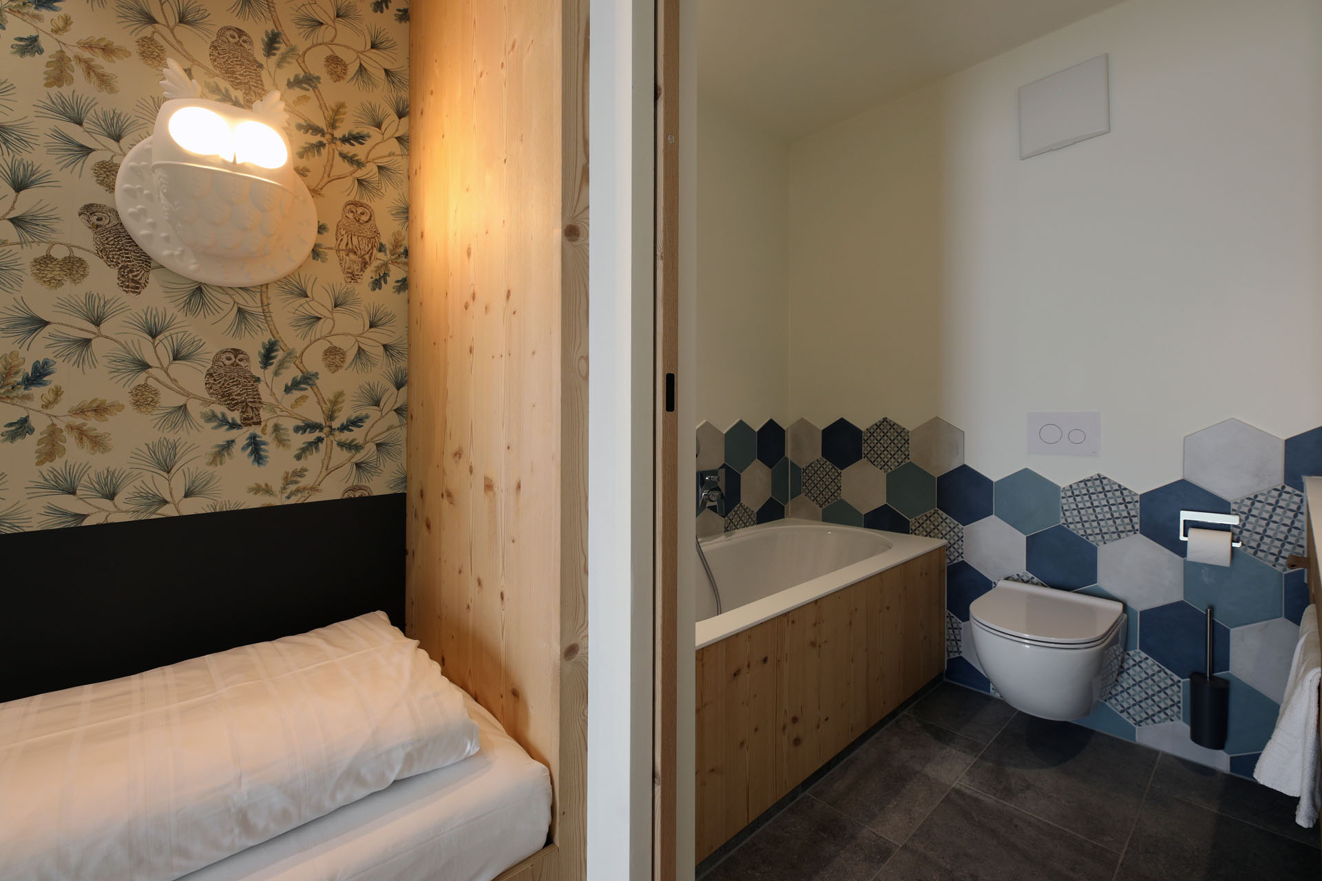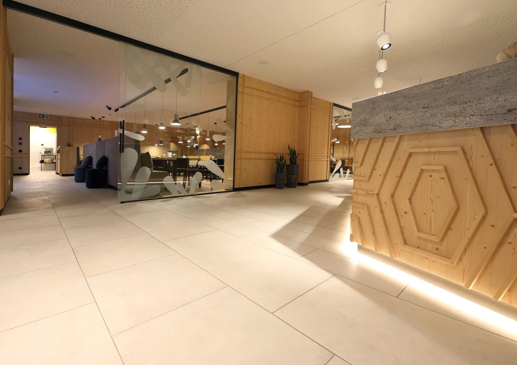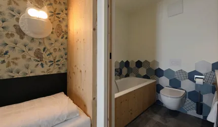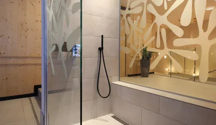 Wir durften im Movi Family Apart-Hotel die gesamte Fliesenlieferung übernehmen und mit den Architekten bei der Auswahl zusammenarbeiten. Den Eingangsbereich verkleidete man mit Feinsteinzeugfliesen in Mehrformatverlegung der gleichen Farbe. Diese Art der Verlegung verleiht dem Raum Lebendigkeit und Bewegung. Dieselbe, dafür aber rutschfeste Fliese wurde in den Schwimmbädern verlegt. Im SPA Bereich der Eltern, wählte man eine dunkle, strukturierte Fliese, welche passend zu den bereits gewählten Schlammfarben war. In allen Kinderbereichen fiel die Auswahl auf Farben, Formen und Fantasie, weshalb der Baby Pool mit bunten 6-eck-Feinsteinzeugfliesen verlegt wurde. Auch in den Appartements wurden die Farbgegensätze verwirklicht und der Kundenwunsch einmal mehr unterstrichen. Die auffallende Einrichtung wirkt, wohin das Auge reicht, wie ein Abenteuer.