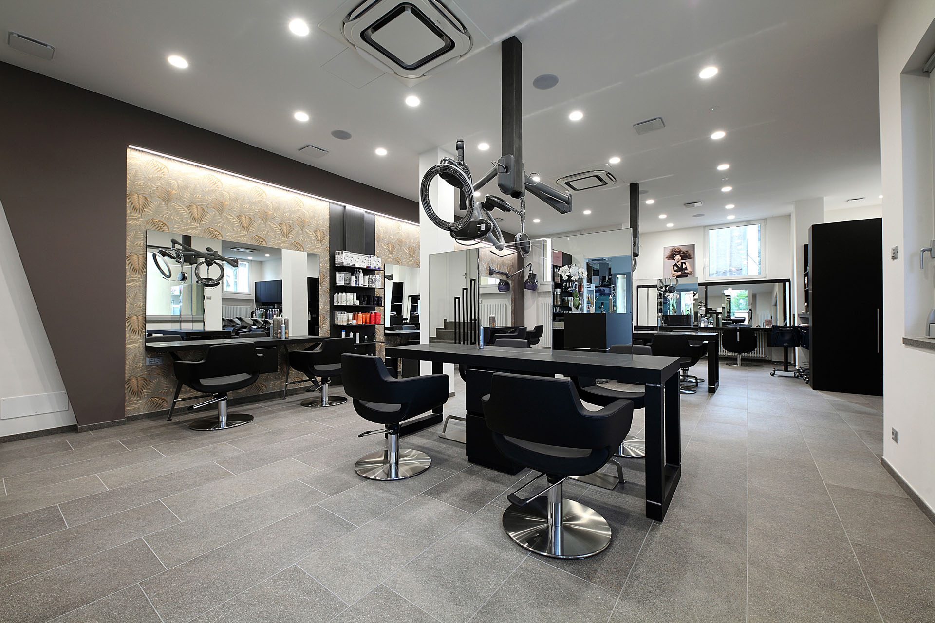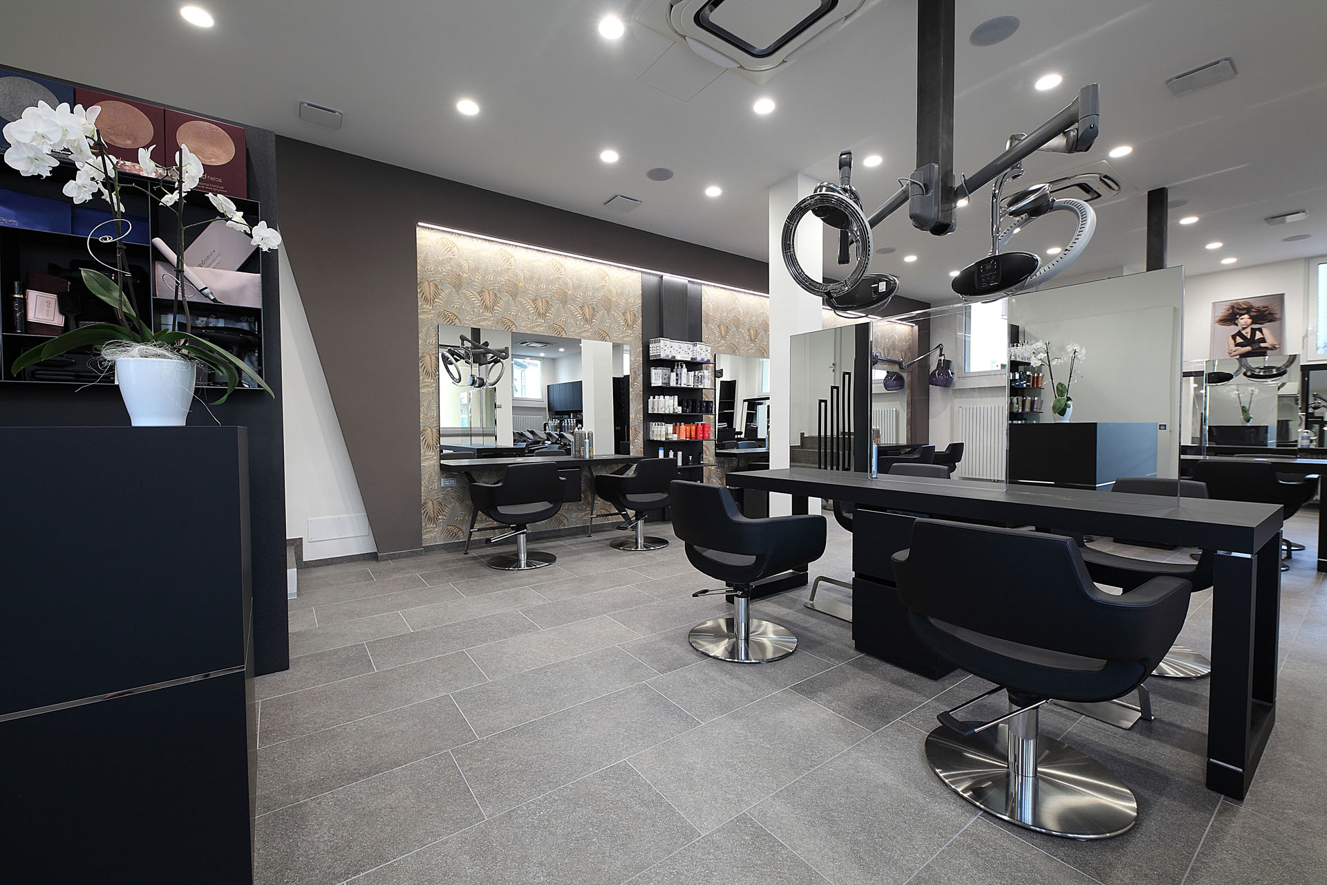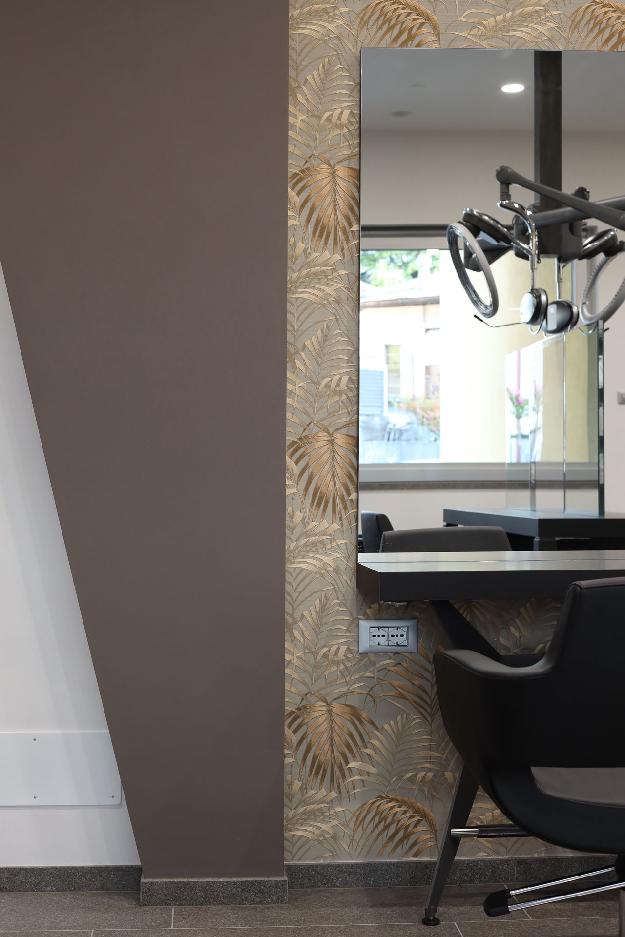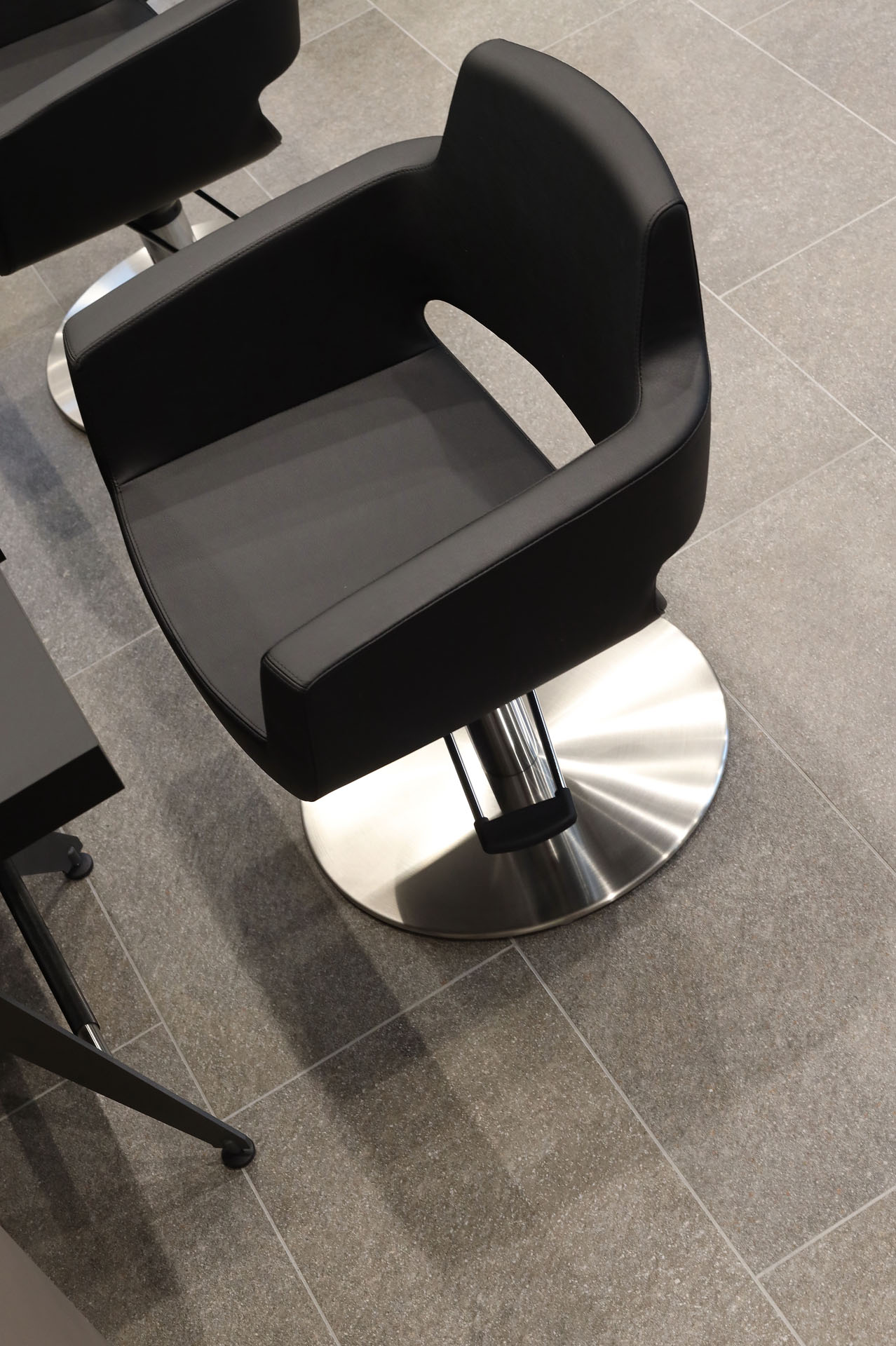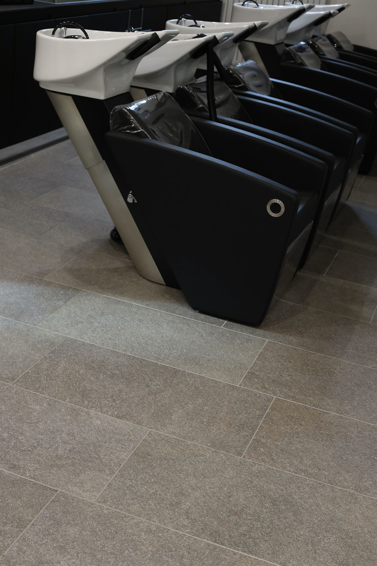 Um für die Bewahrung des ursprünglichen Glanzes und der Authentizität des Salons zu sorgen, wählte man rutschfestes Feinsteinzeug mit Porphyr-Effekt aus dem Cembra Tal. Dieses besondere Produkt, vulkanischen Ursprungs, verleiht dem Salon eine Aura von Eleganz und Raffinesse. Die Feinsteinzeugfliese ist langlebig, nachthaltig, robust und pflegeleicht -Anforderungen, die im Friseursalon wichtig sind. Aus dem ursprünglichen Salon entstand ein Ort der Innovation, Kreativität und Schönheit.