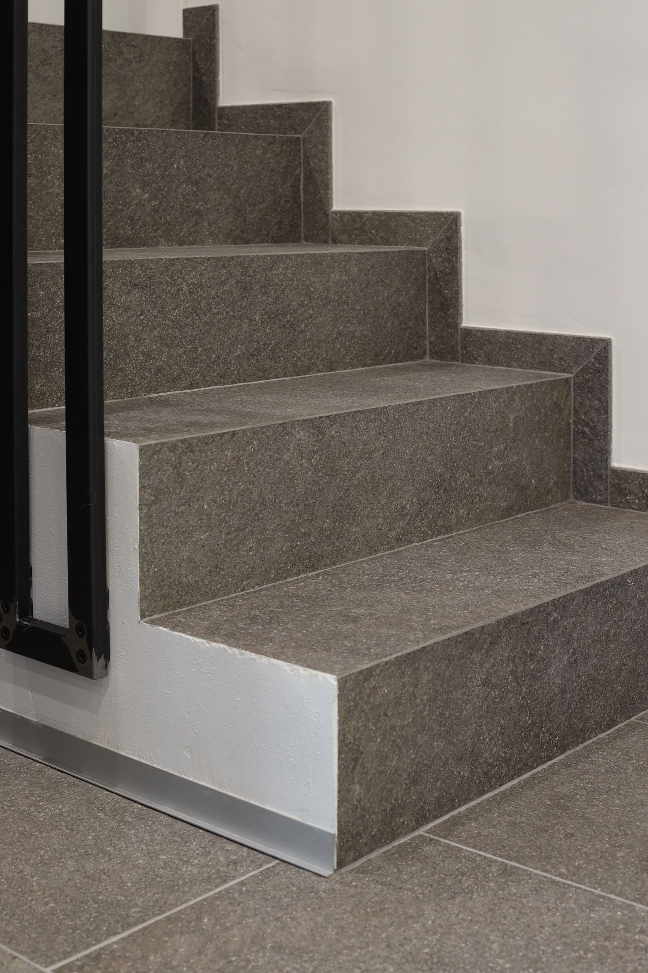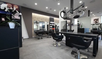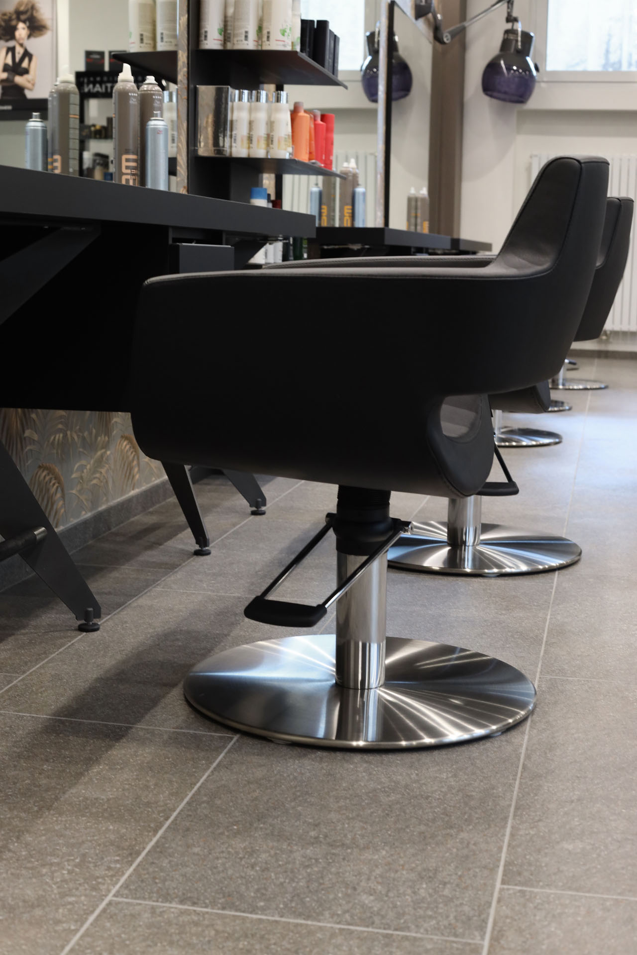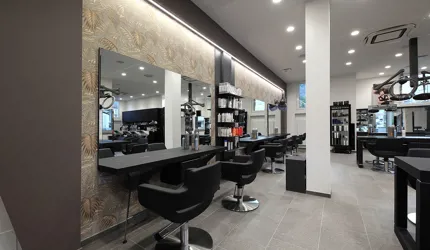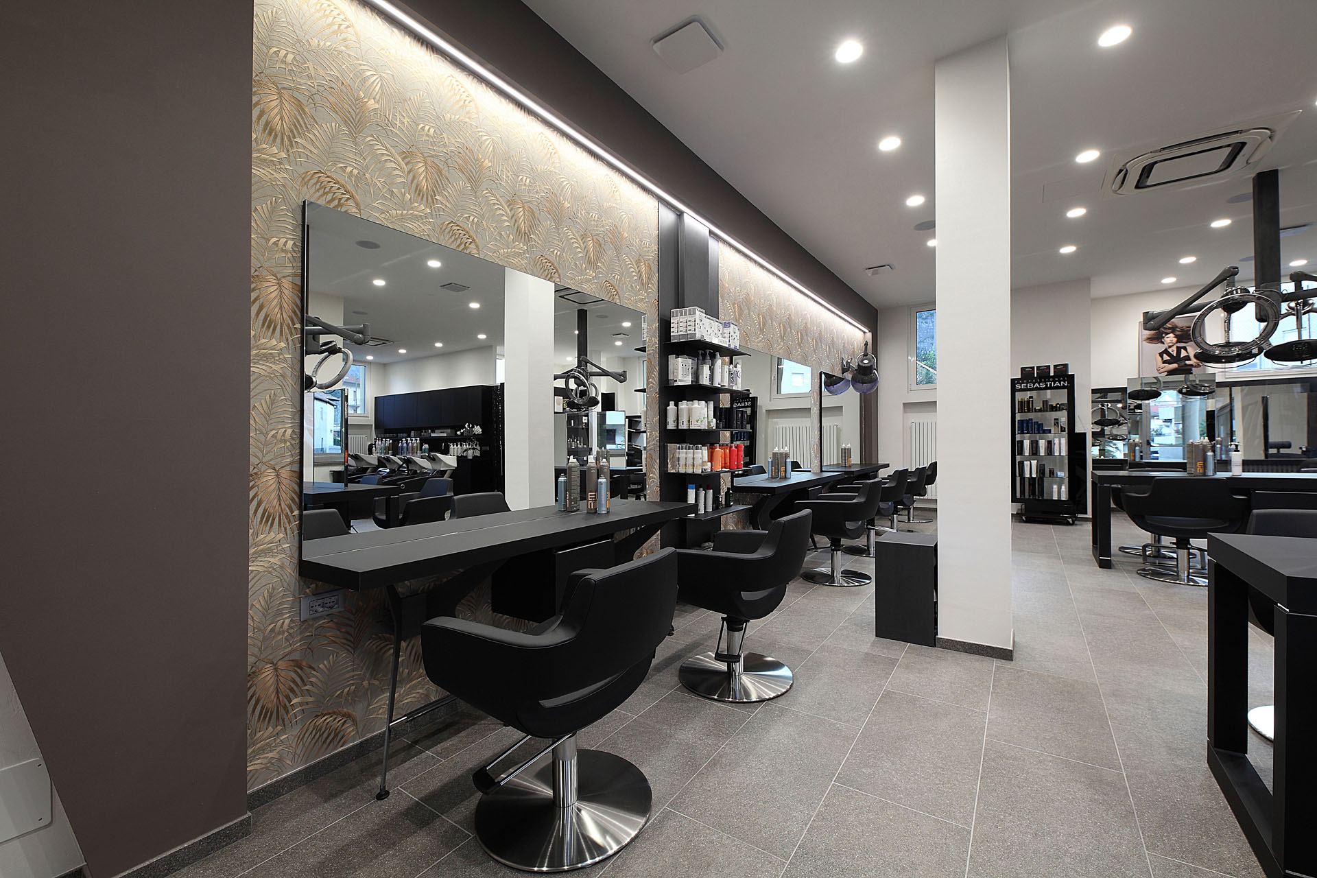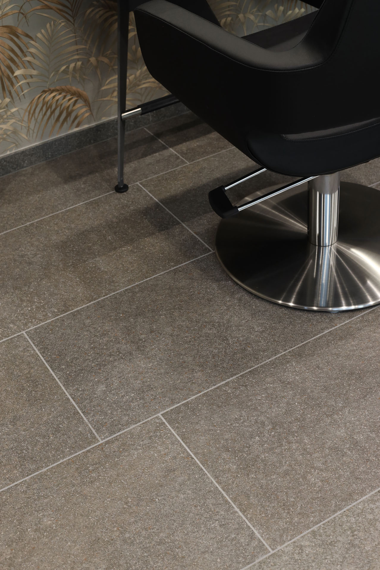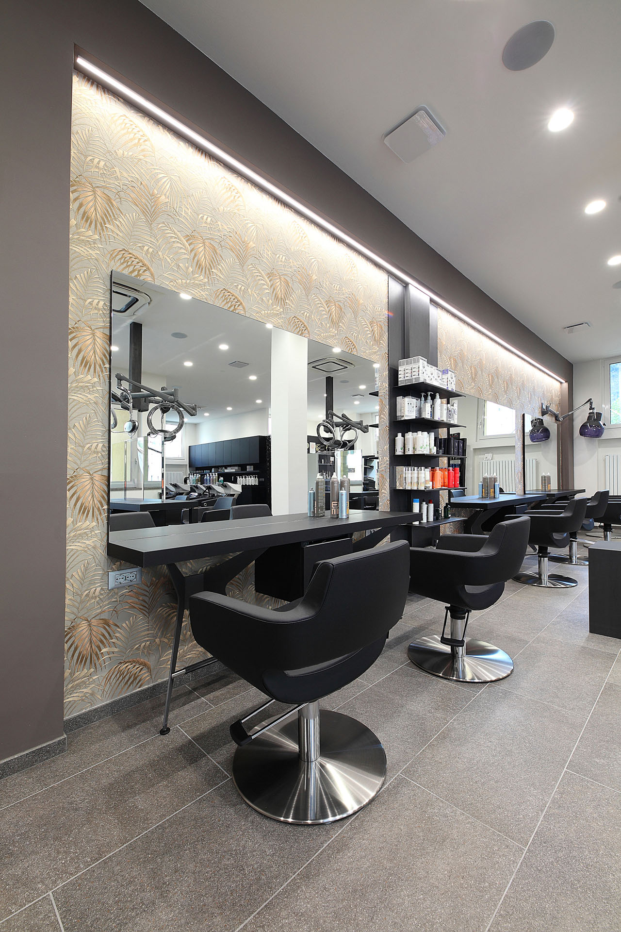 Um für die Bewahrung des ursprünglichen Glanzes und der Authentizität des Salons zu sorgen, wählte man rutschfestes Feinsteinzeug mit Porphyr-Effekt aus dem Cembra Tal. Dieses besondere Produkt, vulkanischen Ursprungs, verleiht dem Salon eine Aura von Eleganz und Raffinesse. Die Feinsteinzeugfliese ist langlebig, nachthaltig, robust und pflegeleicht -Anforderungen, die im Friseursalon wichtig sind. Aus dem ursprünglichen Salon entstand ein Ort der Innovation, Kreativität und Schönheit.