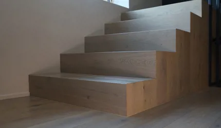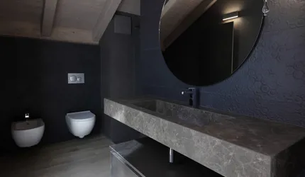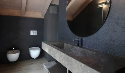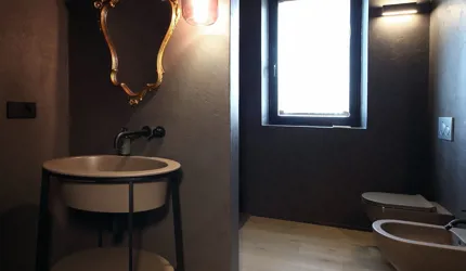Abbiamo accompagnato la realizzazione di questa bellissima casa in tutte le fasi di progetto. Per i pavimenti e il rivestimento della scala sono state scelte tavole in legno rovere variegato, spazzolato e biocompatibili: creano un clima interno piacevole, sono robuste e di facile manutenzione. Il primo bagno è arricchito di cementine decorative posate a tappeto con la posa continuativa a rivestimento. Nel secondo bagno a rivestimento abbiamo posato della resina con finitura strutturata, accostata a gres tridimensionale. Il lavoro è poi proseguito con le pitture, l’arredo bagno, i sanitari, la rubinetteria e le porte.