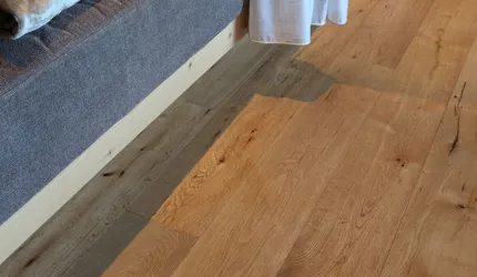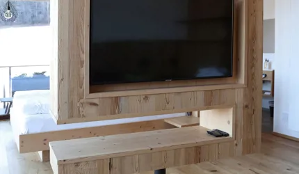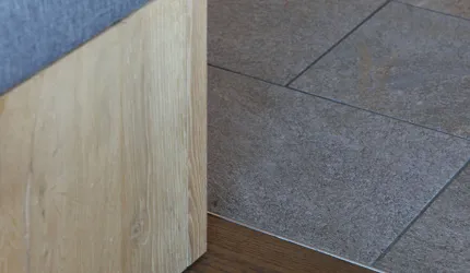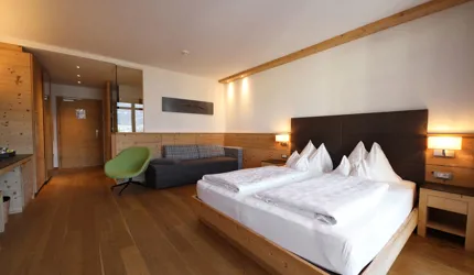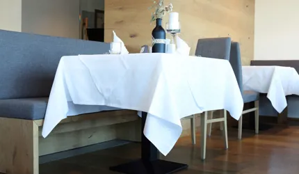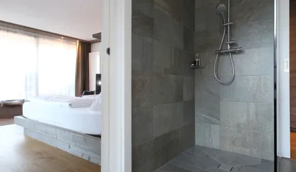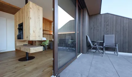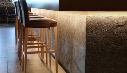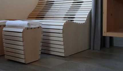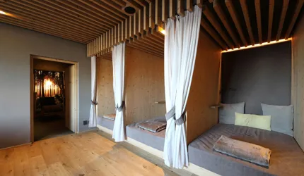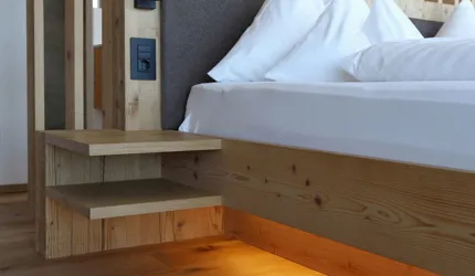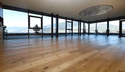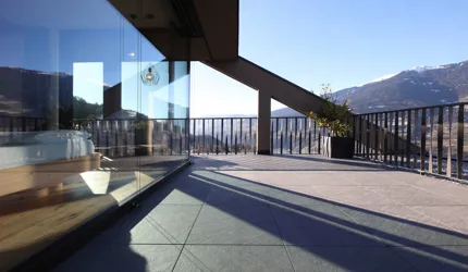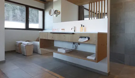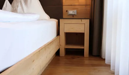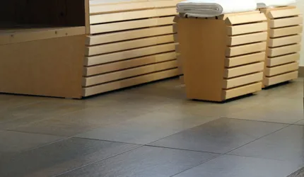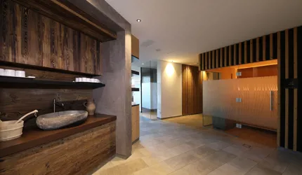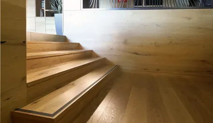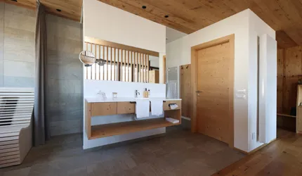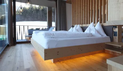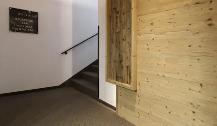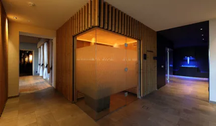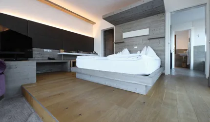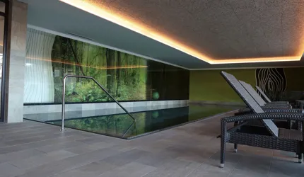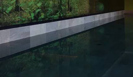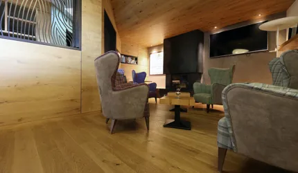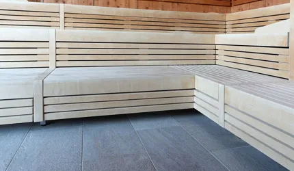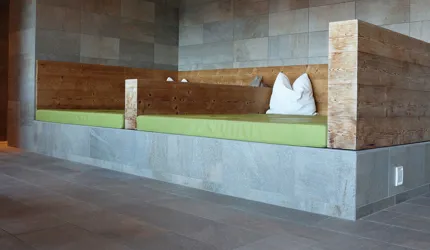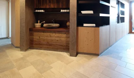 Le piastrelle in pietra naturale scelte, che non solo sono eccezionalmente belle da vedere, ma soddisfano anche le necessarie classi di resistenza allo scivolamento e sono allo stesso tempo durevoli, pervadono buona parte dell’hotel – ingresso, bar, piscina, bagni e corridoi. La nuova sala seminari è stata arredata con legno naturale, trattato in superficie ad olio per mantenere le sue originali caratteristiche. I pavimenti in legno sono stati posati anche nelle camere, nelle scale e in alcuni corridoi. L'area esterna della piscina è stata dotata di pannelli in WPC: sono resistenti alle intemperie, durevoli, conferiscono all'intero spazio esterno della piscina un’aura di arminioso equilibrio con il paesaggio circostante. Una parete con rivestimento anch’esso in pietra naturale, che si estende dall'ingresso all'area esterna, raccorda le due zone dell’albergo e invita ad esplorarne gli ambienti.