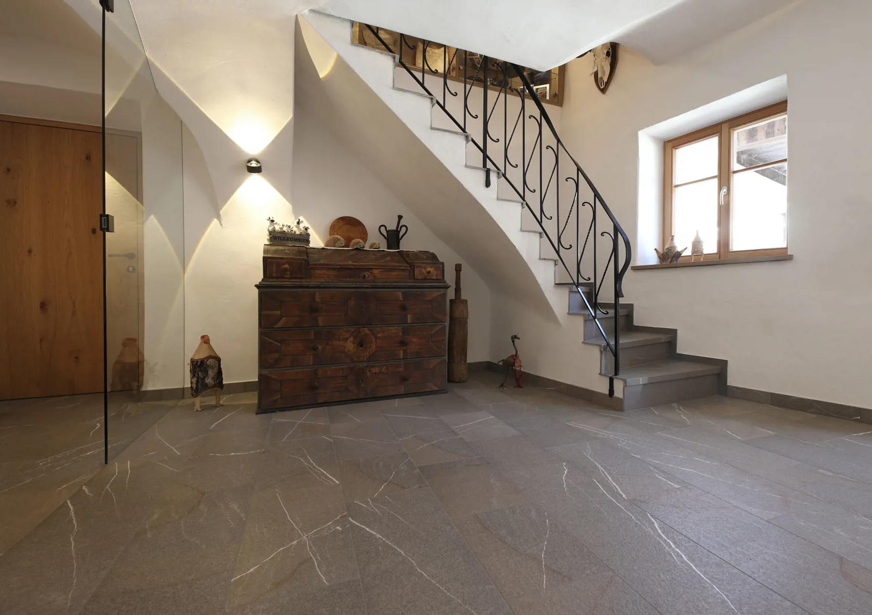 In linea con i desideri del cliente, nella ristrutturazione sono stati utilizzati solo materiali di origine naturale, per preservare l'autenticità e il fascino di questo maso unico nel suo genere. L'ingresso è stato dotato di un pavimento in pietra naturale di facile manutenzione, fiammato e spazzolato. Nel nuovo appartamento per le vacanze, i pavimenti in legno si distinguono per la durabilità dei materiali scelti. In altre zone del maso sono state posate piastrelle effetto pietra, che si integrano perfettamente con l'ambiente in cui è immersa la struttura.