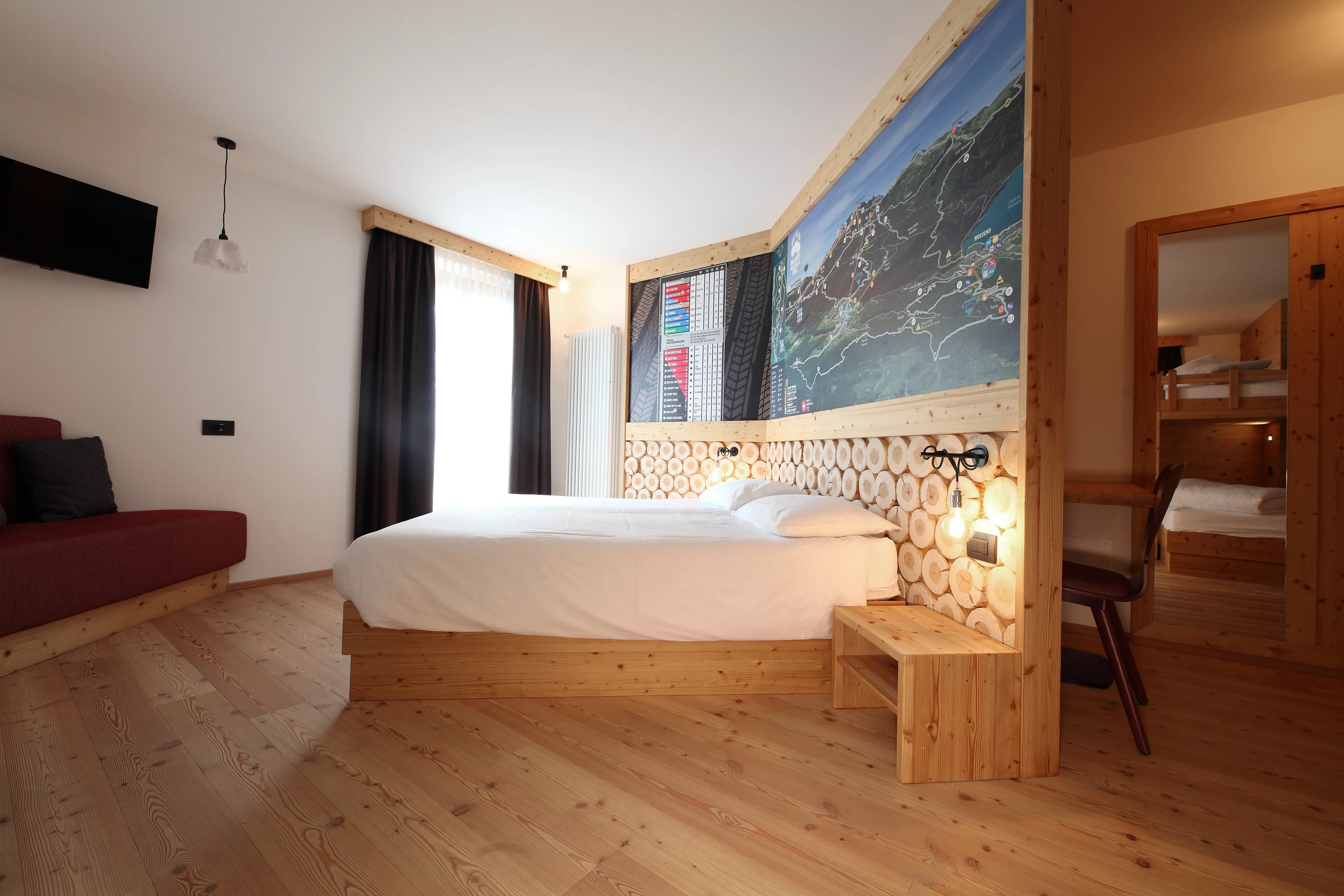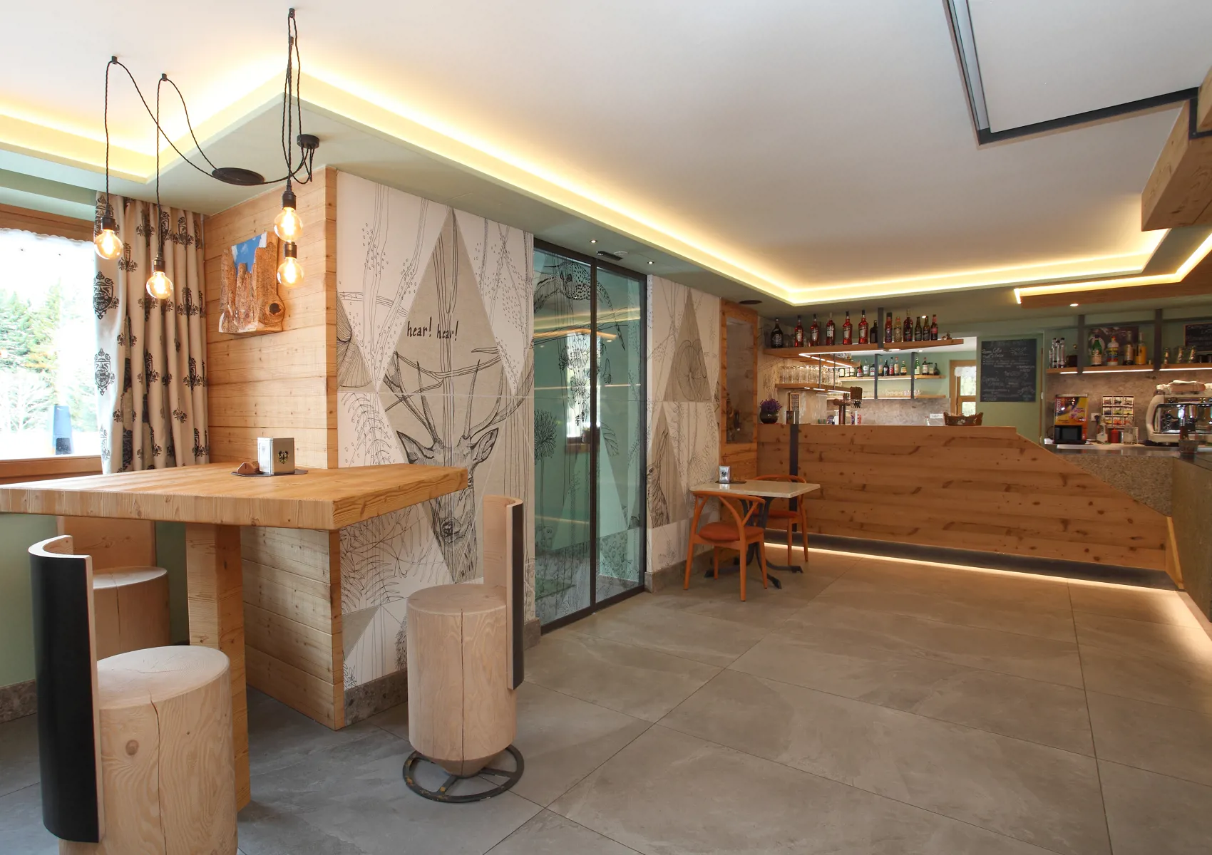 Per i pavimenti del bar e del ristorante è stato utilizzato un grès con effetto roccia sedimentata, materiale resistente e durevole. Il grès effetto legno è stato scelto per le scale e il seminterrato. Il salone è stato rivestito con tavole di larice invecchiato e al piano superiore, nelle camere e nelle scale, sono state posate tavole di larice in tinta. Nei bagni della baita è stato utilizzato un grès con effetto pietra. Tutti i materiali naturali scelti contribuiscono a valorizzare la struttura immersa nel patrimonio mondiale dell'UNESCO.